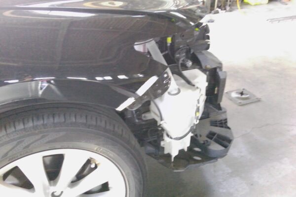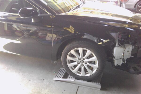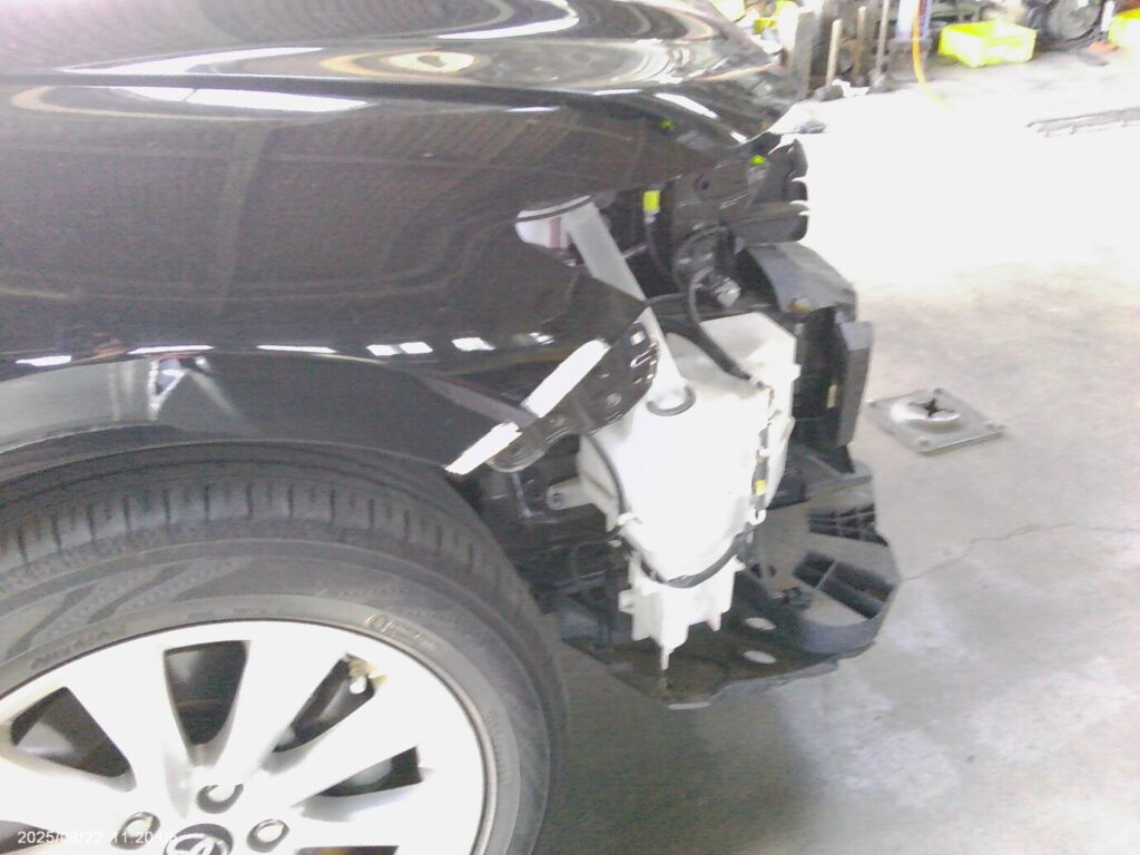 ご来店時に、フロントバンパーの割れ・右フェンダーのヘコミ・ヘッドランプの破損を丁寧に確認。