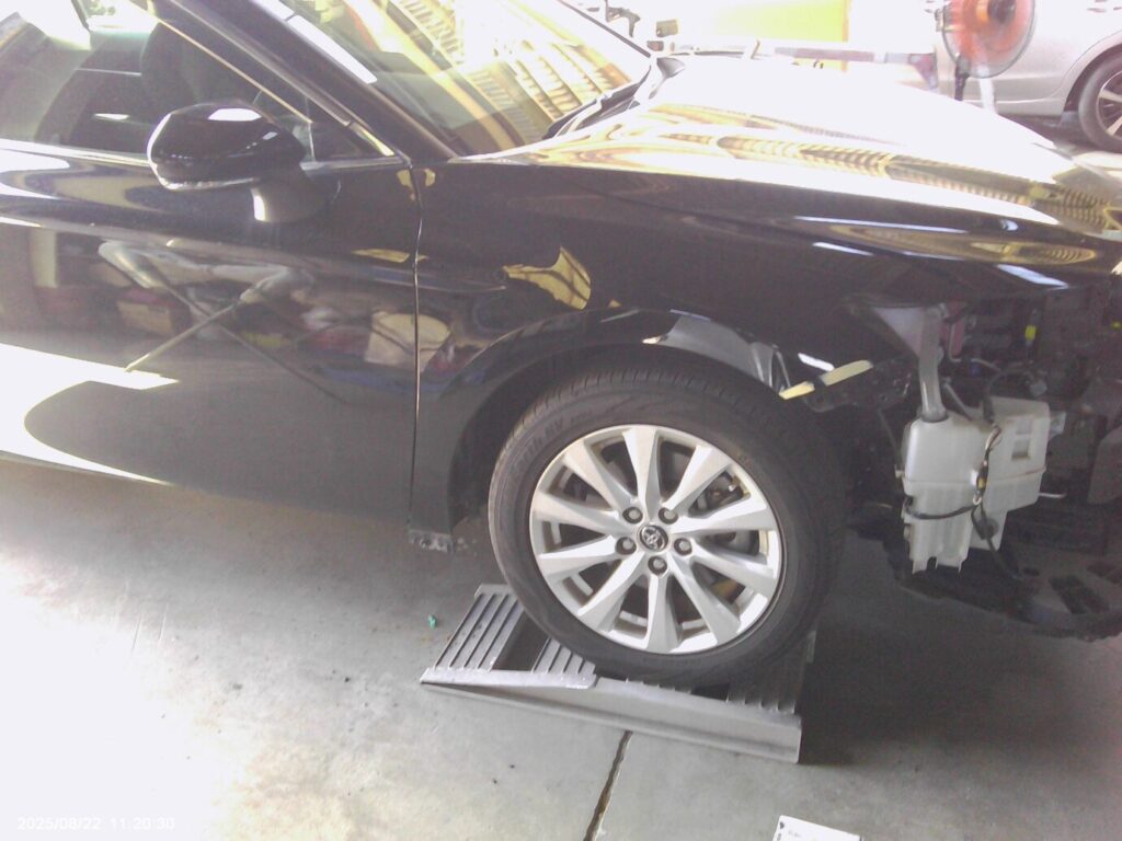 宝塚市の方よりご依頼いただいた、トヨタ・カムリのフロント周り事故修理(フロントバンパー交換・右ヘッドランプ交換・右フロントフェンダー鈑金塗装)事例です。