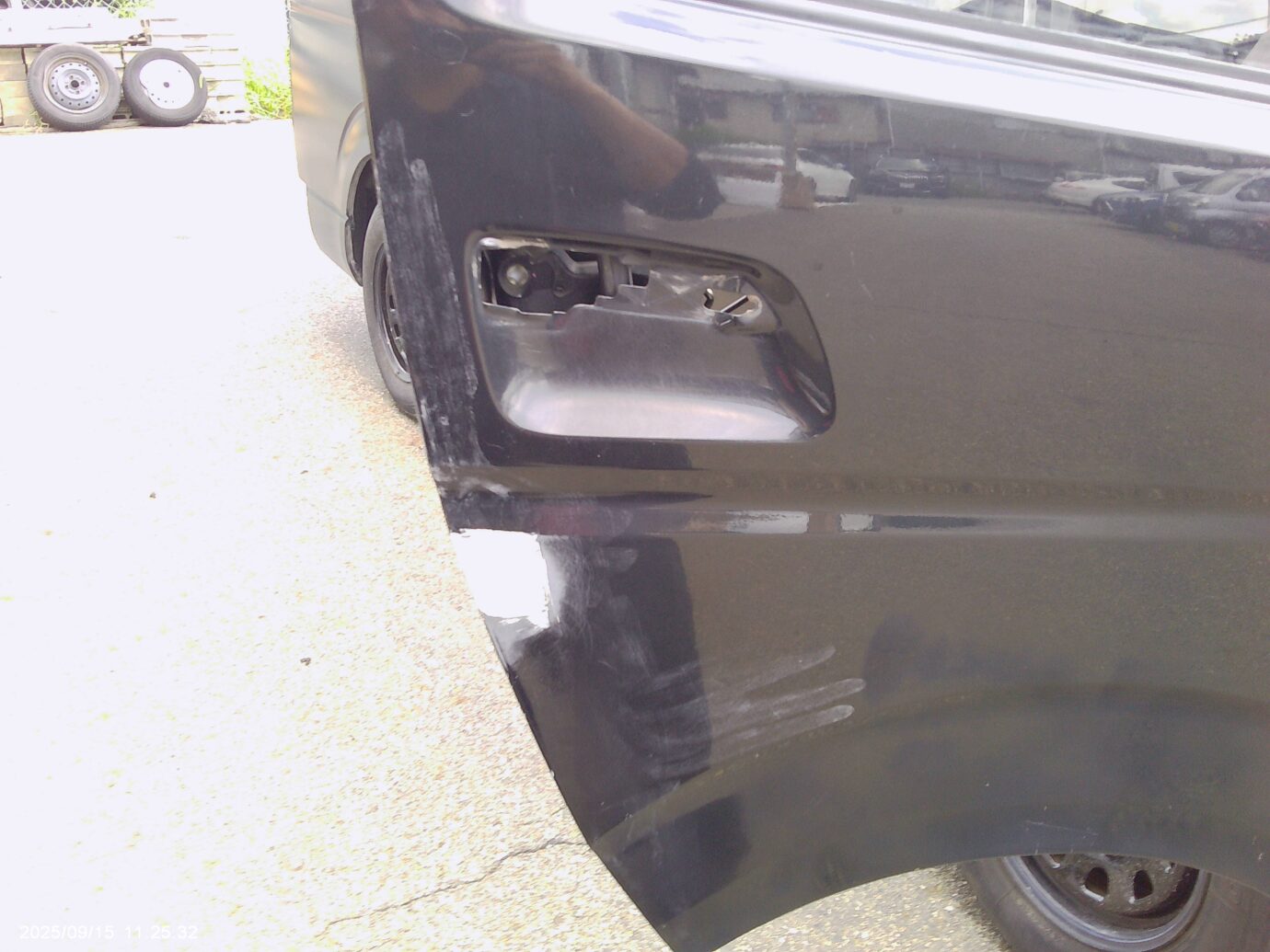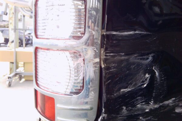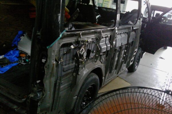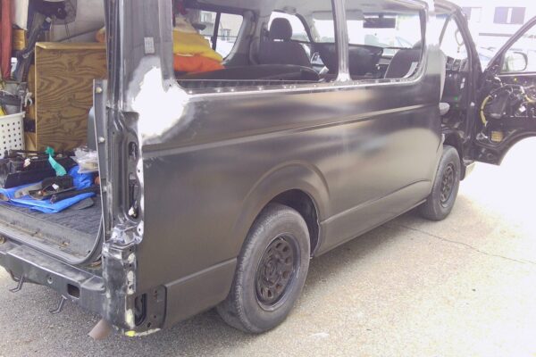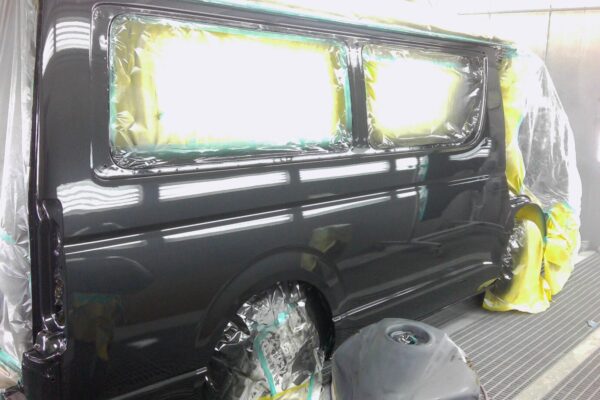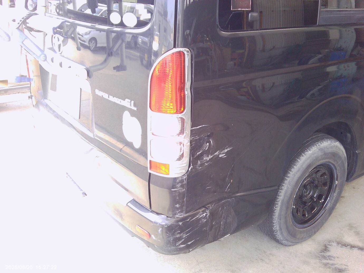 今回はトヨタ・ハイエース(商用車)のリア周り損傷によるご依頼をいただき、リアバンパー交換塗装・右リアフェンダー交換塗装・ガラス脱着・右テールランプ交換を行いました。