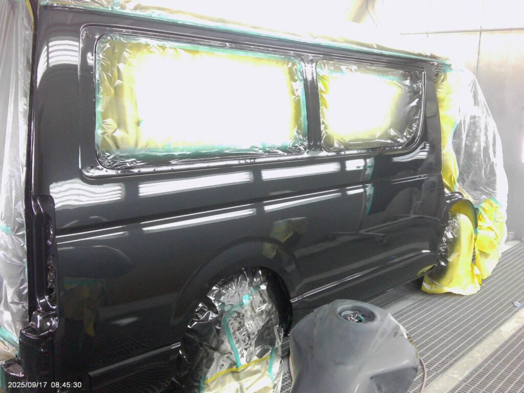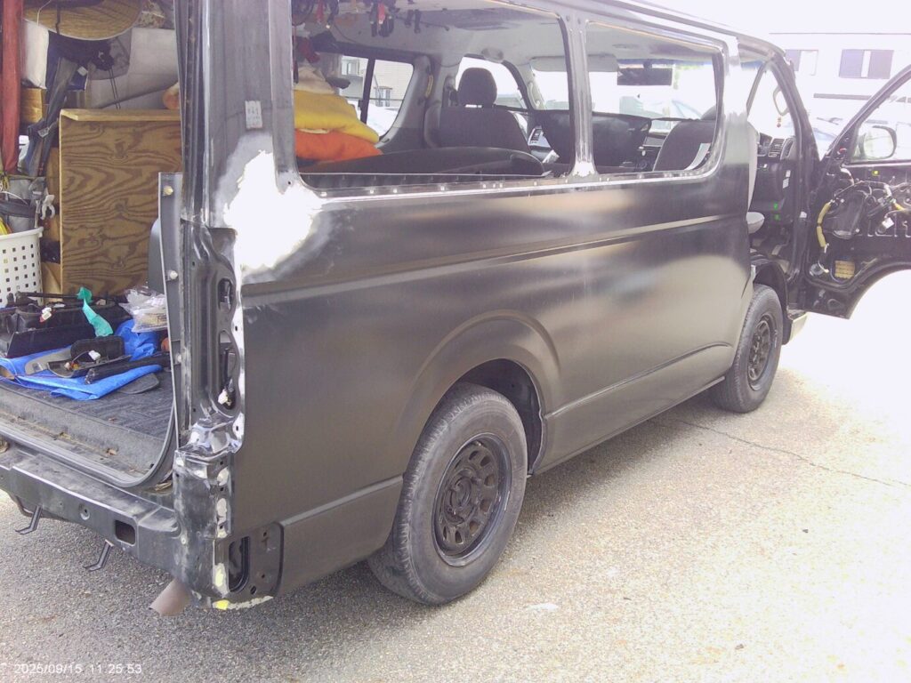 今回はトヨタ・ハイエース(商用車)のリア周り損傷によるご依頼をいただき、リアバンパー交換塗装・右リアフェンダー交換塗装・ガラス脱着・右テールランプ交換を行いました。