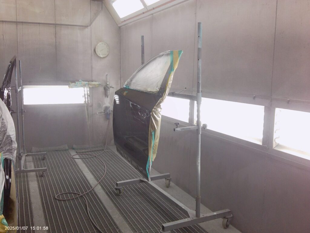 今回の交換塗装では、新しいドアと既存のボディの色がズレないよう、隣接するフロントドアにまで色をぼかしながら塗る「ちらし塗装(ボカシ塗装)」を実施。マツダ車の深みのあるメタリック色も違和感なく再現し、キズ修理跡のない、完璧な仕上がりをお約束します。