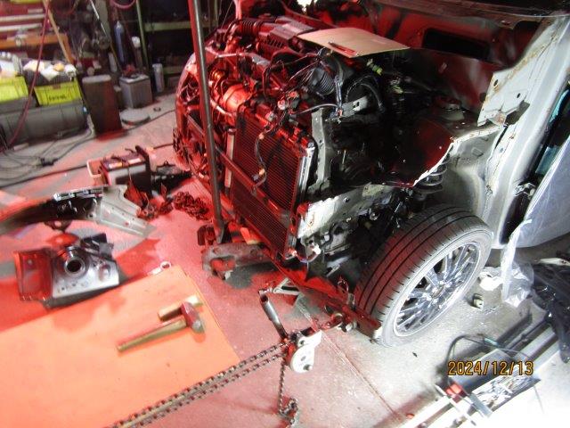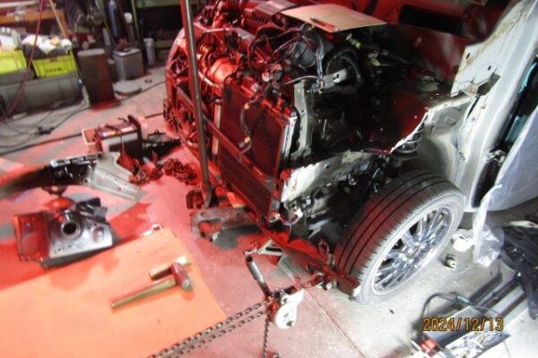 フロントバンパー・左フェンダー・ヘッドランプ・ドア、そして足まわりの状態を細かく点検。衝撃がどこまで及んでいるかを判断し、修理方法を明確にします。