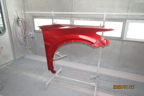 さらに、右フロントドアも損傷していたため、脱着して鈑金塗装を行っています。これほど大規模な車 修理では、部品交換の正確さと、交換した部品が周囲のパネルと完全に色やラインが一致する板金塗装技術が求められます。