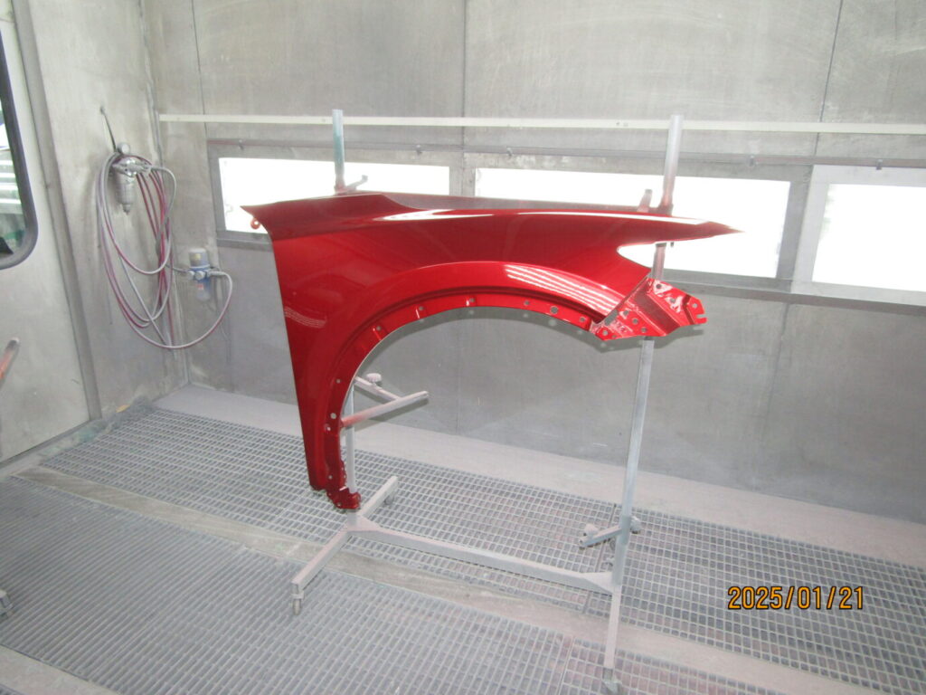 さらに、右フロントドアも損傷していたため、脱着して鈑金塗装を行っています。これほど大規模な車 修理では、部品交換の正確さと、交換した部品が周囲のパネルと完全に色やラインが一致する板金塗装技術が求められます。
