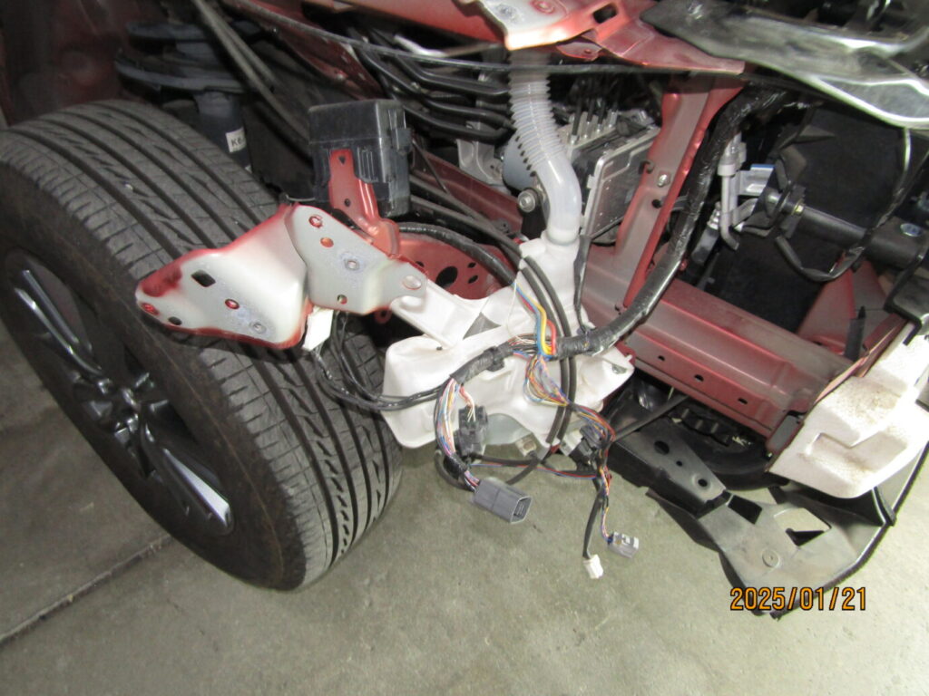 今回の事故修理は、フロントバンパー、ボンネット、右フロントフェンダーの交換に加え、衝撃が内部骨格に及んでいたため、インナー鈑金作業も実施しました。